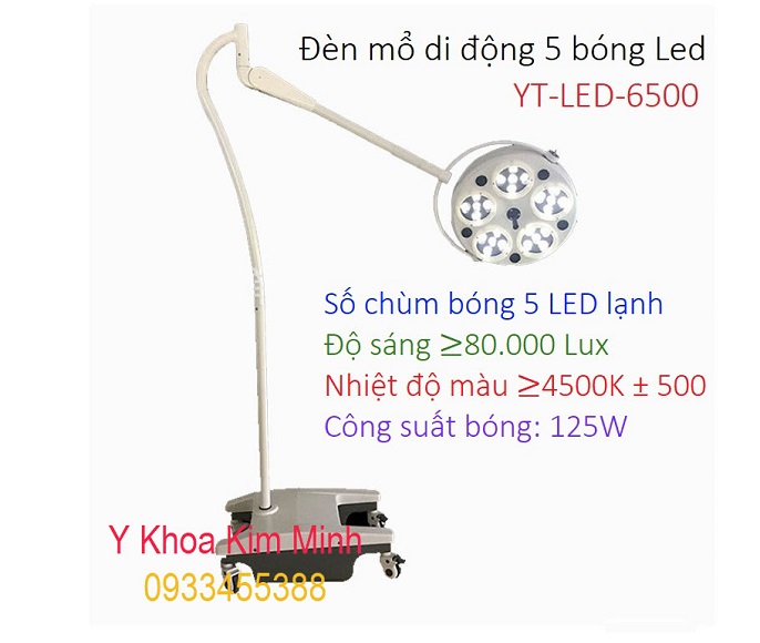 Đèn mổ phẫu thuật 5 bóng Led YT-LED6500 sử dụng chân di động dễ di chuyển, với nguồn ánh sáng lạnh ngay đầu điểm ≤1 °C và cường độ chiếu sáng 100.000 Lux. Đèn y tế YT-LED6500 thích hợp cho tiểu phẫu, phẫu thuật y tế thẩm mỹ được các bác sĩ tin dùng bán ở Y Khoa Kim Minh.