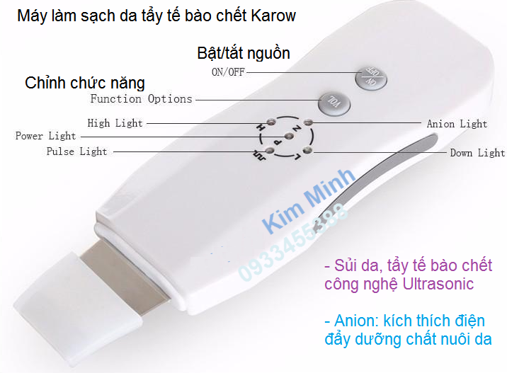 Máy làm sạch da tẩy tế bào chết Karow dùng 2 chức năng bao gồm sóng siêu âm dùng để tẩy tế bào da chết làm sạch da và sóng ion âm chuyên dùng đẩy dưỡng chất nuôi da chăm sóc da.